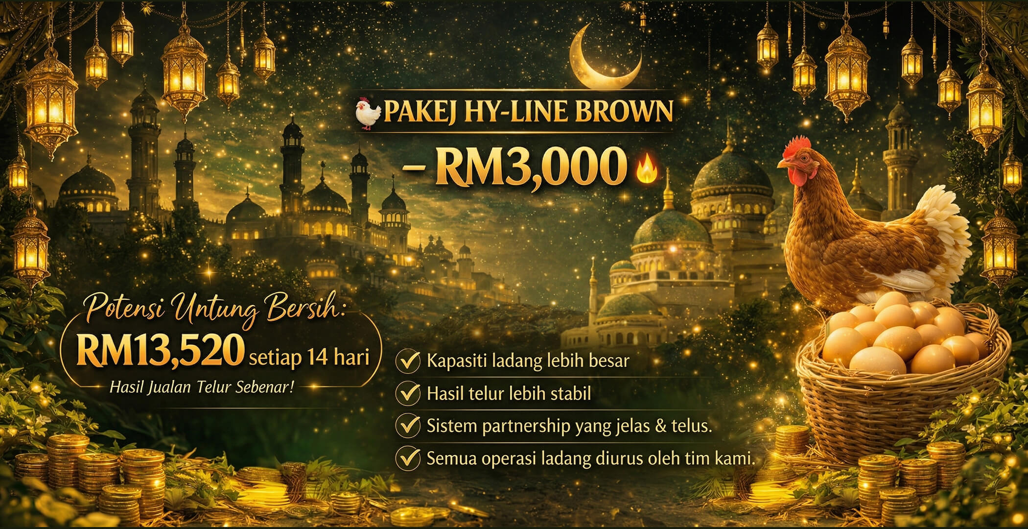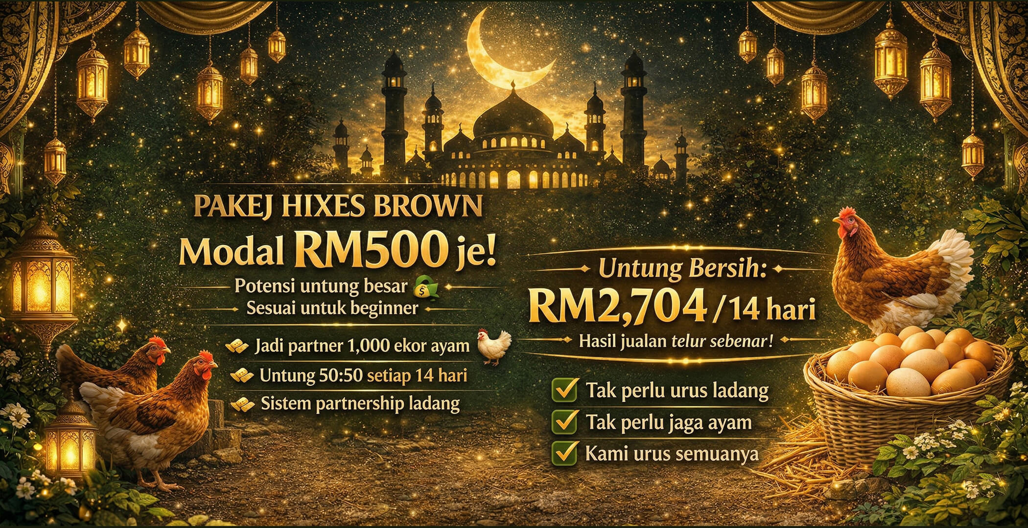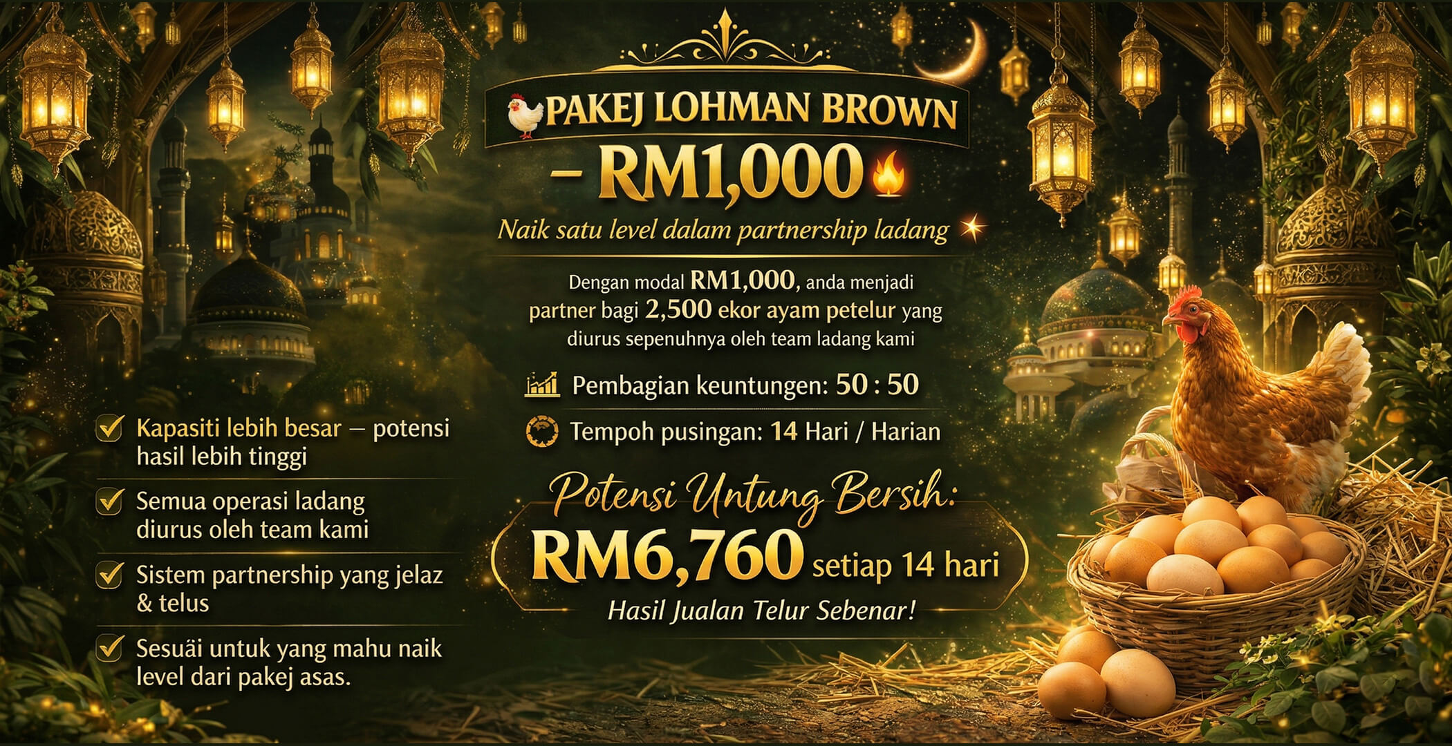 Anda hanya perlu menaruh modal, kemudian pihak kami akan mengurus semua ayam. Telur dijual setiap hari, dan keuntungan dibahagi secara adil.